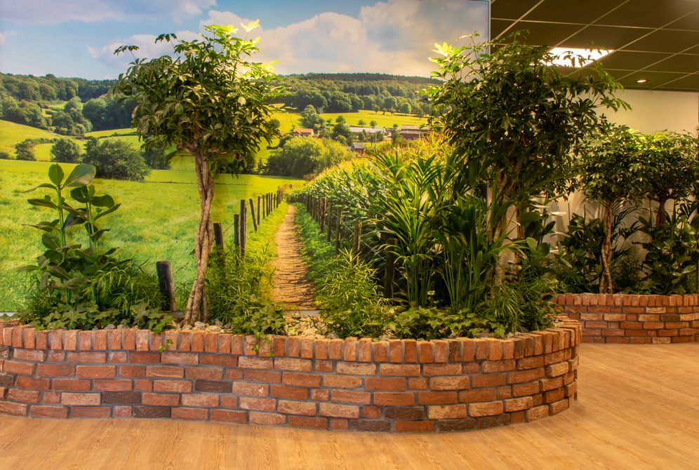 Wij ontwierpen nieuwe cliëntkamers, gangen, huiskamers, prikkelarme ruimtes voor drie verschillende afdelingen, een kapsalon en separate wellnessruimte alsook een centrale ontmoetingsplek op de begane grond waar door middel van diverse thema's 'buiten' naar binnen werd gebracht. Grote uitdaging was eenheid te brengen in het gebouw: waar voorheen met name de begane grond uit diverse afzonderlijke ruimtes bestond, transformeerden wij deze tot één grote ruimte: een dorpsplein met daaromheen diverse thema's uit de omgeving zoals de 'Schinveldse Bossen', de 'Roode Beek" en 'Nonke Buusjke".